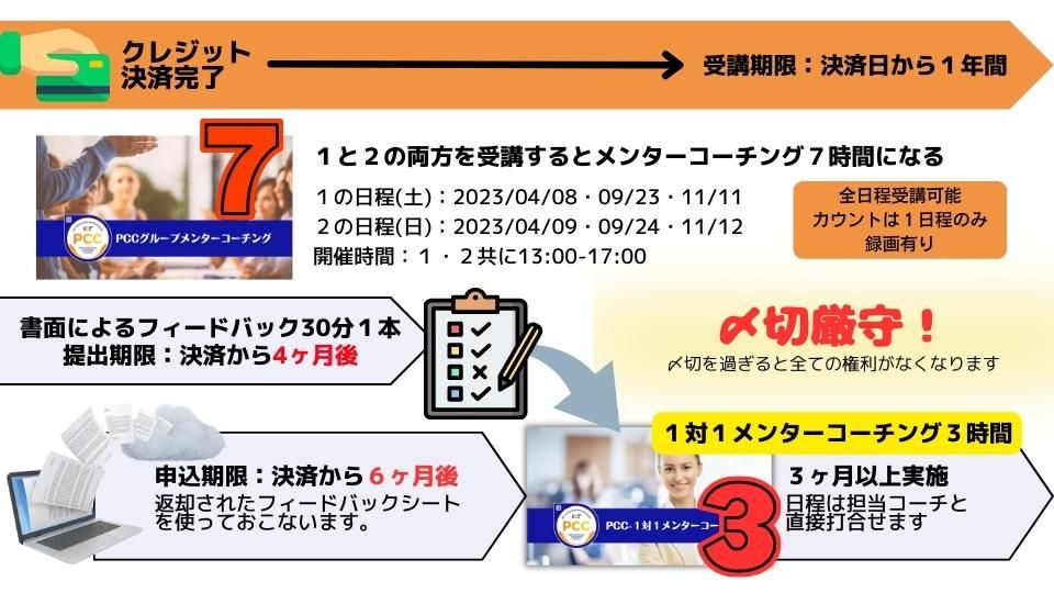 全日程出席可。1と2を履修し、フィードバックセッションを提出することで、ICFが求めるメンターコーチング10時間のうち7時間を満たします。